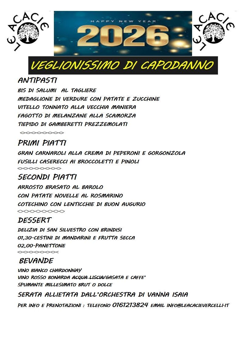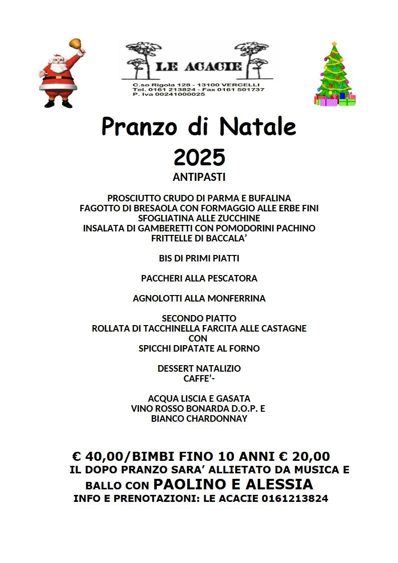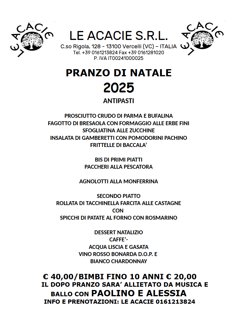 Le Acacie è un ristorante pizzeria con centro sportivo e discoteca annessa. Il locale è una storica realtà di Vercelli che da oltre 40 anni delizia i clienti con autentiche specialità tipiche della cucina piemontese. Franco e Adriano, i titolari dell'attività, sono da sempre apprezzati per la qualità dei manicaretti cucinati e per l'atmosfera serena e conviviale che hanno saputo ricreare e portare avanti negli anni. Oggi il ristorante porta avanti la tradizione iniziata nel 1972 con la pizzeria Marechiaro, uno storico locale nato sotto i portici di Pizza Cavour nel cuore della città.